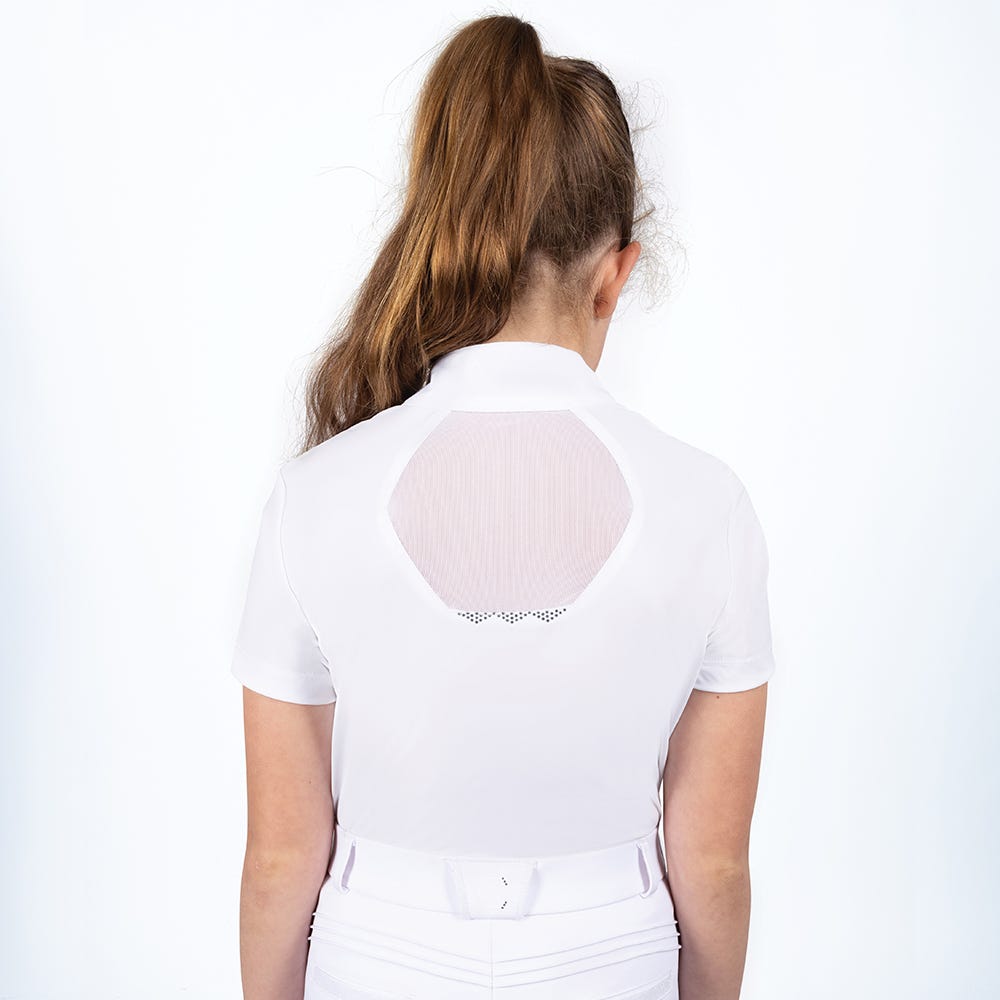 • Our Lanark Show Shirt is a uniquely designed piece for the active equestrian athlete. Engineered in a revo-tech performance material to regulate body temperature and wick moisture away from the body, allowing for a fresh and hygienic feel when needed most. Featuring a fine mesh hexagon lined with delicate diamantes to the front and rear, this modern styling not only looks great, but optimises breathability and helps regulate body temperature, The stand up white collar is fastened with press studs and features a co-ordinating diamante emblem, for an elegant style.