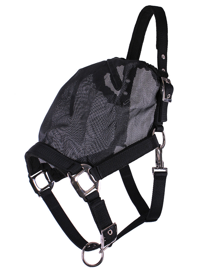 This high quality head collar features an attached fly mask. This way the horse is well protected against insects, but can also be lead or tied. The top of the mask is elasticized for a good fit around the face. The cheekpieces, noseband and browband are lined with fleece for comfort. Colour: Black Sizes: Pony, Cob, Full Details 1081: Material tape: polypropylene Material mask: textilene Material hardware: nickel plated Head collar with attached fly mask Crown piece adjustable on both sides Adjustable at the noseband Snap closure on the throat latch Fine mesh fly mask With elastic browband Fleece lined noseband, cheek pieces, crown and browband