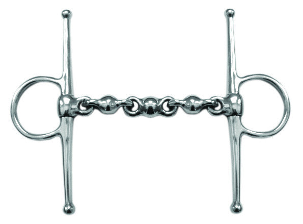 This bit has full cheeks to help with steering and a mouthpiece made up of many different links to make it harder for the horse to pull or lean against it.