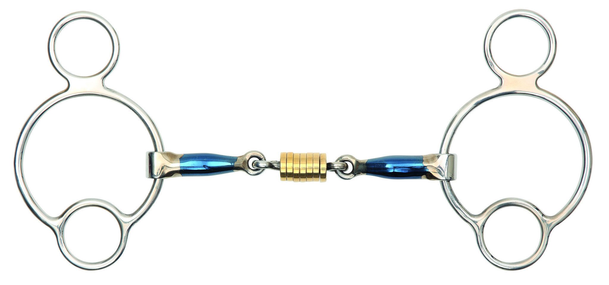 Combines poll pressure and leverage, for a mild gag action. The loose brass alloy discs in the centre can help to soothe a fussy tongued horse.