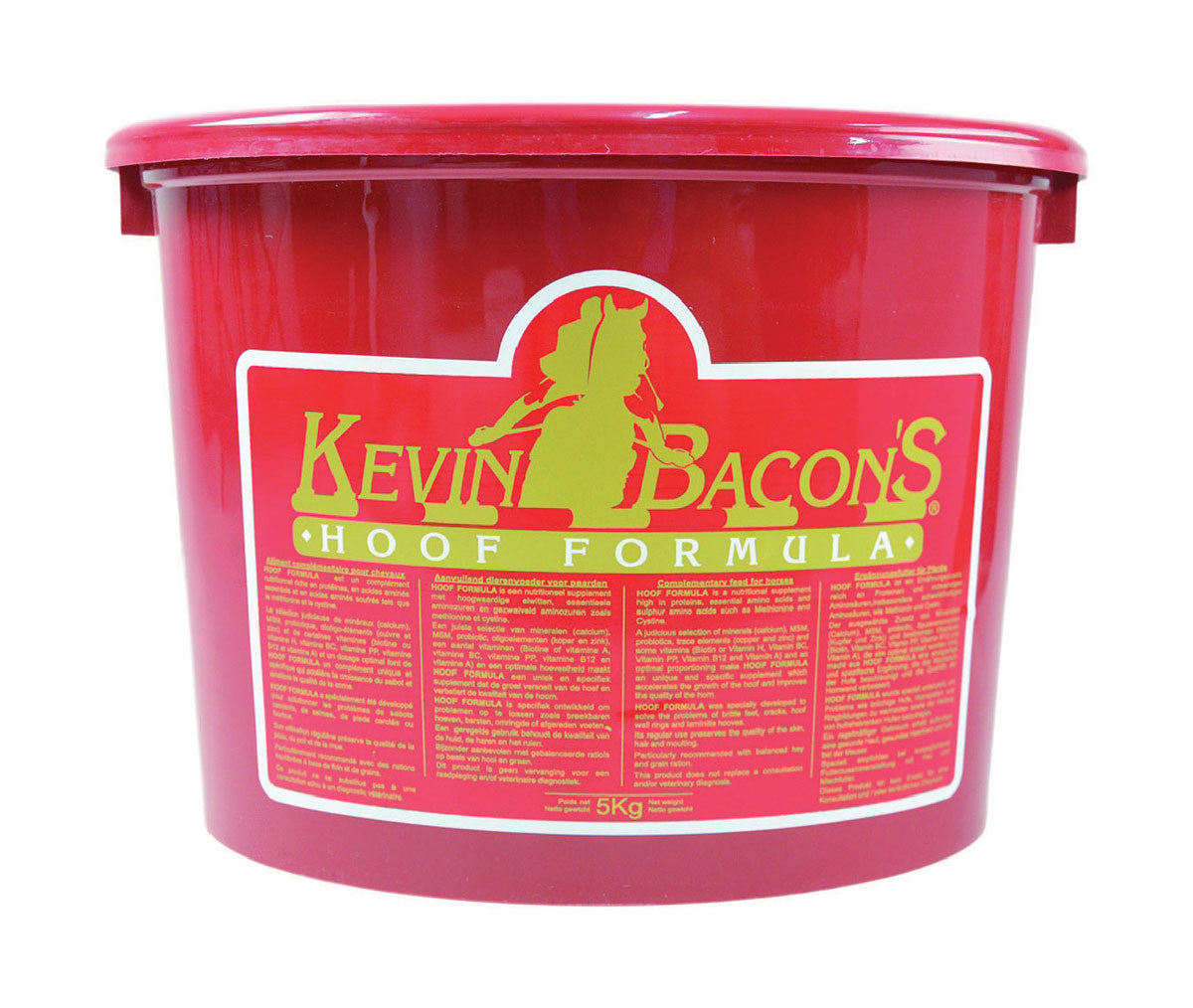 Kevin Bacon's Hoof Formula is a highly digestible, nutritional supplement scientifically formulated to assist the growth and quality of the horses' hoof. It has been formulated and tested by the Dept. of Veterinary Medicine at the University of Liège . It is one of the most concentrated supplements on the market with high levels of Biotin (500mg/kg) and Vitamin A (975,000 IU/kg). This sulphur enriched formula contains 37% crude proteins that are particularly rich in essential amino acids, with high levels of methionine (42gm/kg) and cystine (42gm/kg). The Hoof Formula is suitable for horses at all levels of training, including equine athletes on a high grain diet. Kevin Bacon's Hoof Formula contains high levels of calcium (117gm/kg), optimum levels of magnesium, potassium and phosphorous and trace elements copper, zinc, cobalt and iodine Kevin Bacons Hoof Formula is the ultimate supplement for quality horn growth in addition to helping to promote a healthy coat and skin Feeding Instructions: Horses 1 measure (160gm) per day Ponies 1/2 measure (80gm) per day Foals 1/4 measure (40gm) per day Maintenance: One half of the daily measure