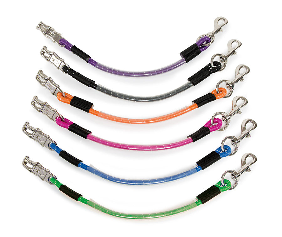 This calming, shock absorbing robust bungee line quickly tethers the horse in the stable, yard or trailer or two can be used to safely cross tie a familiarised horse. If the horse pulls, the bungee line offers gentle resistance which reduces stress. Featuring a swivel trigger clip at one end and a panic release at the other, the polyester bungee is encased in a clear plastic tube to reduce wear and tear. Total length 62cm, unstretched bungee length 44cm.