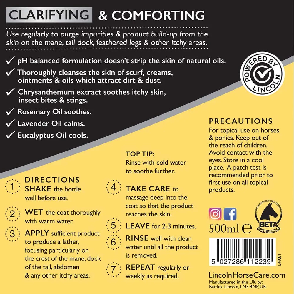 • More than just a shampoo! An ‘anti-rub’ cleanser formulated for use regularly from March through to November, or whenever Midges first appear. The pH balanced formulation of Chrysanthemum extract, Rosemary Oil, Lavender Oil & Eucalyptus Oil can be used frequently without drying the skin. Regular use clarifies, removing dead skin & scurf, thoroughly removing ‘build-up’ from protective fly ointments to help to reduce mane & tail rubbing and the associated skin trauma. Silicone free. No added fragrances. For prolonged results, use in conjunction with Itchy Switchy S.O.S Skin Soother.