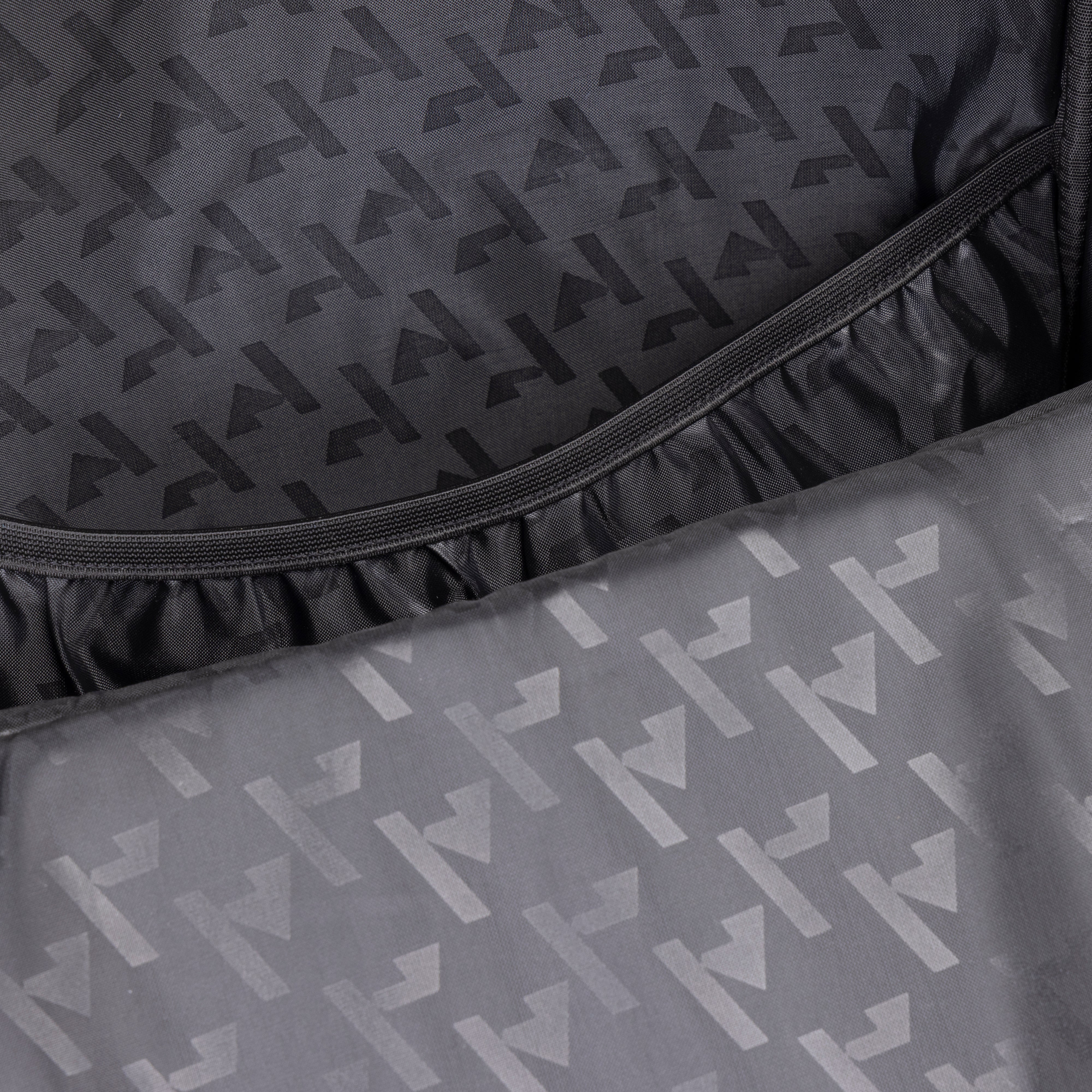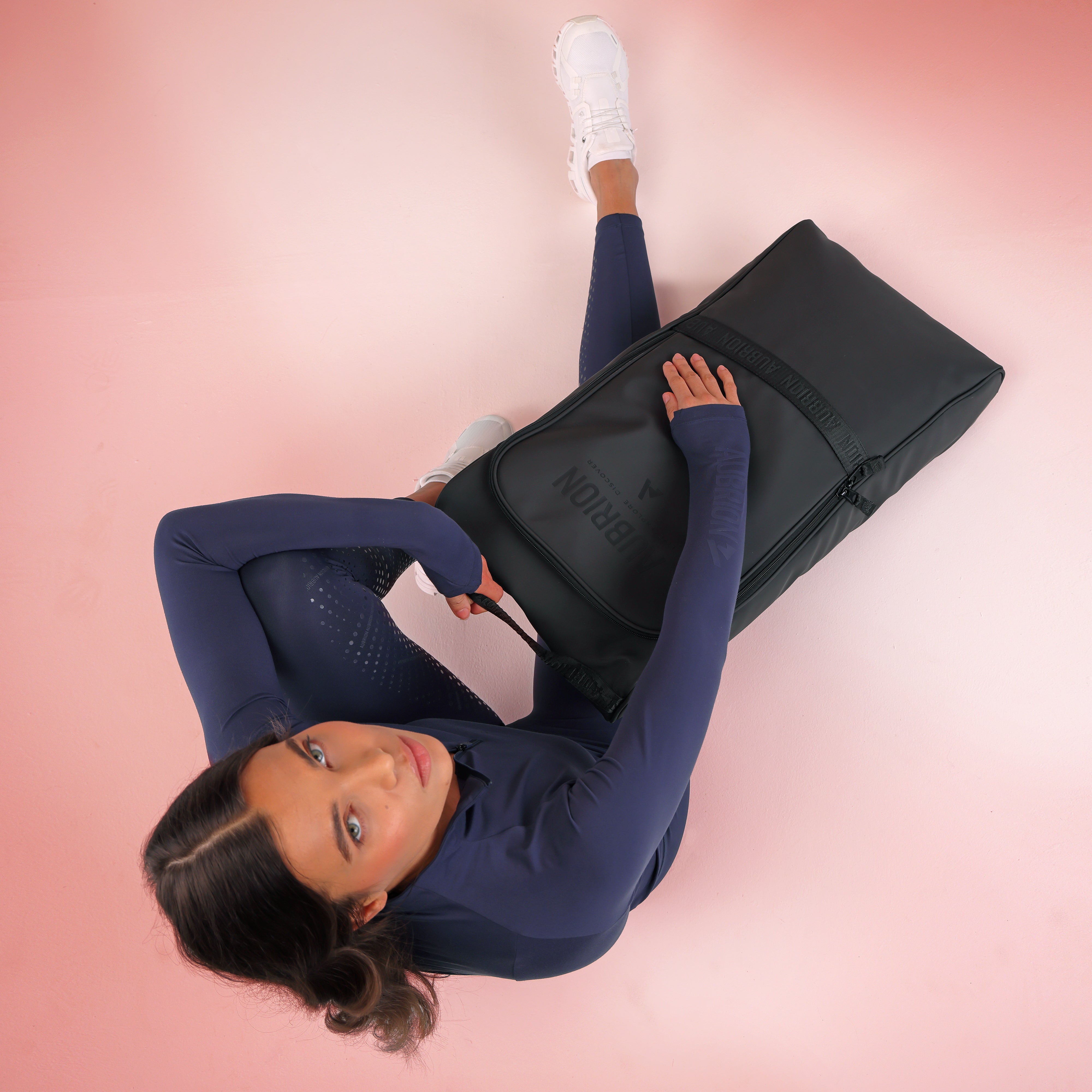 • Keep bridles tidy and safe in the sleek Aubrion React bridle bag. Inside the bag there is plenty of space and a clip opening hanging strap to keep leatherwork secure, a large inner pocket section keeps accessories tidy. The wipe clean outer has a sporty feel, and the bag is styled with smart signature web. An outer hook allows the bag to be hung for convenience. Further detail: two-way zip, top grab handle, full jacquard lining, edge piping for extra durability, hardwearing feet, matt logo prints. Dimensions: W.32cm, H.67cm, D.12cm. Part of the sporty & practical Aubrion React luggage range.