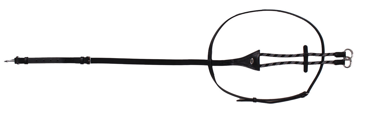 Leather running martingale finished with two-tone cord. Leather stop between cords and adjustable on two ways Colours: Black Sizes: Shetland, Pony, Cob, Full Details 2113: Material: Leather, polypropene Running martingale made of leather Finished with two-tone cord Leather stop in between the cords Two-way adjustable Silver coloured stainless steel hardware