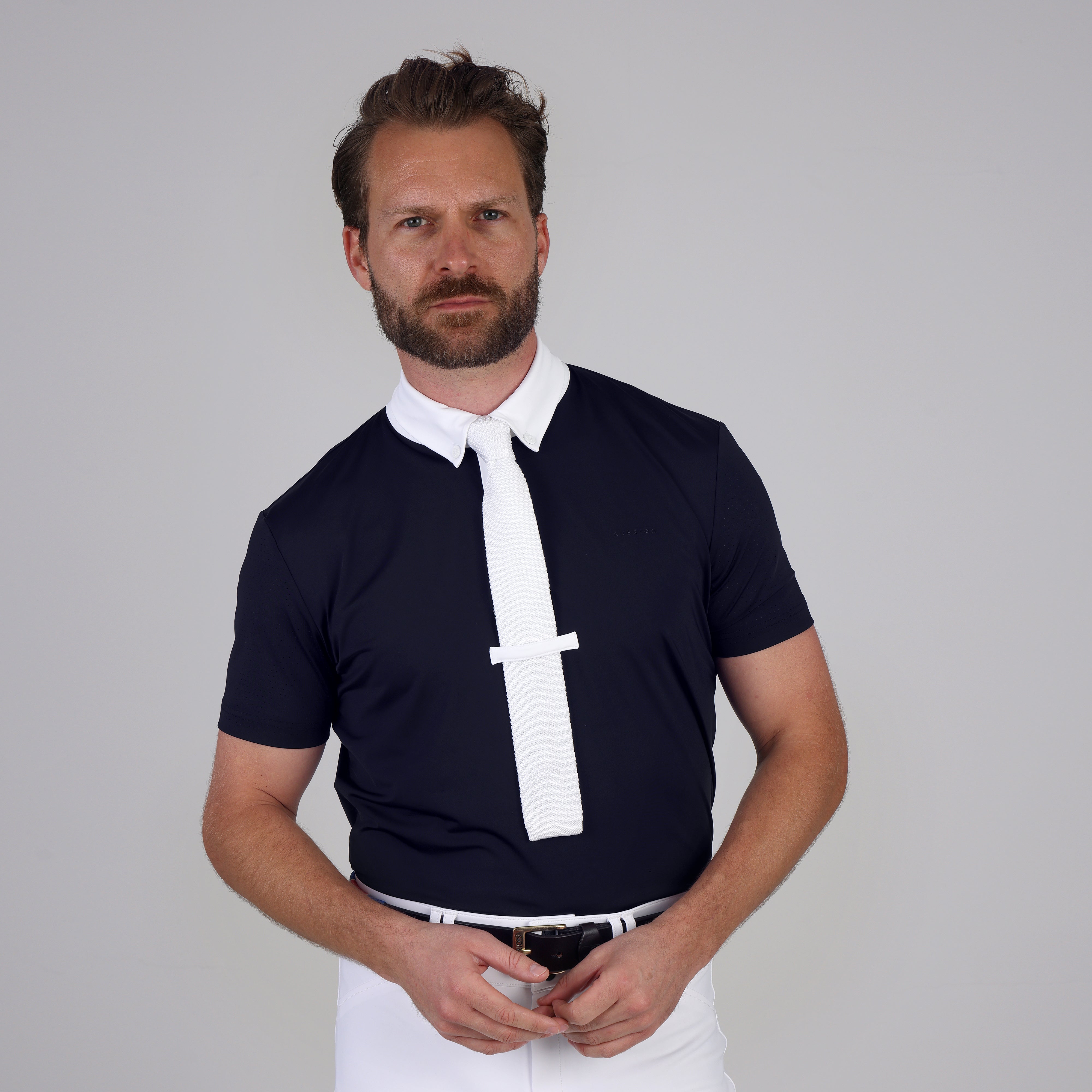 • Aubrion Optima is created for elite competition performance using modern design technology, innovative fabrics, and championship ready styling. Optima mens show shirts offer the competitive rider advanced mobility and technical support through all levels of competition and all disciplines. The cut allows a relaxed fit; the zip fastening collar, tie keeper and short sleeves present a neat finish. Cool stretch fabric feels soft and comfortable; perforated sleeves and back panel, moisture management and quick dry technologies give fresh feel athletic efficiency. Smart and timeless, the MX design incorporates traditional styling details, offering a classic and polished presentation that never goes out of style. A refined self-colour Aubrion logo at the chest adds a subtle nod to elevated equestrian design. Further detail: zip fastening with covered placket, button down tie collar, UPF50 main body fabric, tie keeper, monogram buttons, perforated sleeves and back panel, four-way stretch, moisture wicking, quick drying, comfort seams, Aubrion logo print. Designed to comply with GB affiliated competition rules.