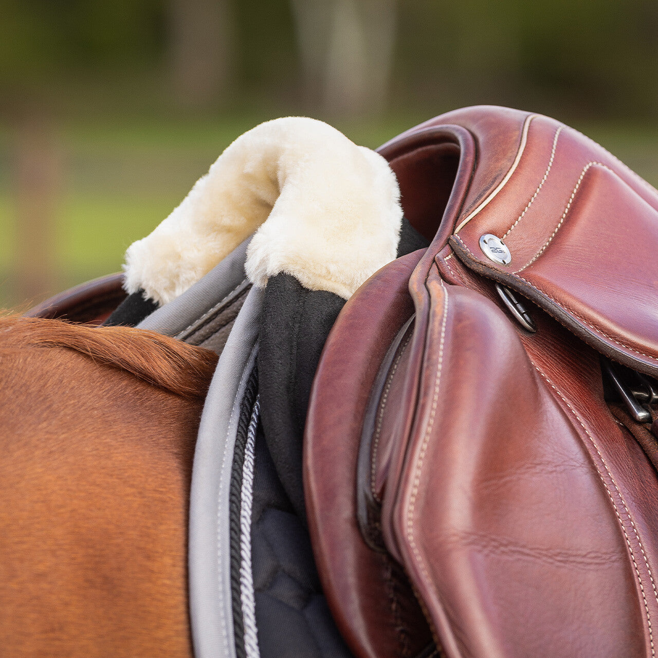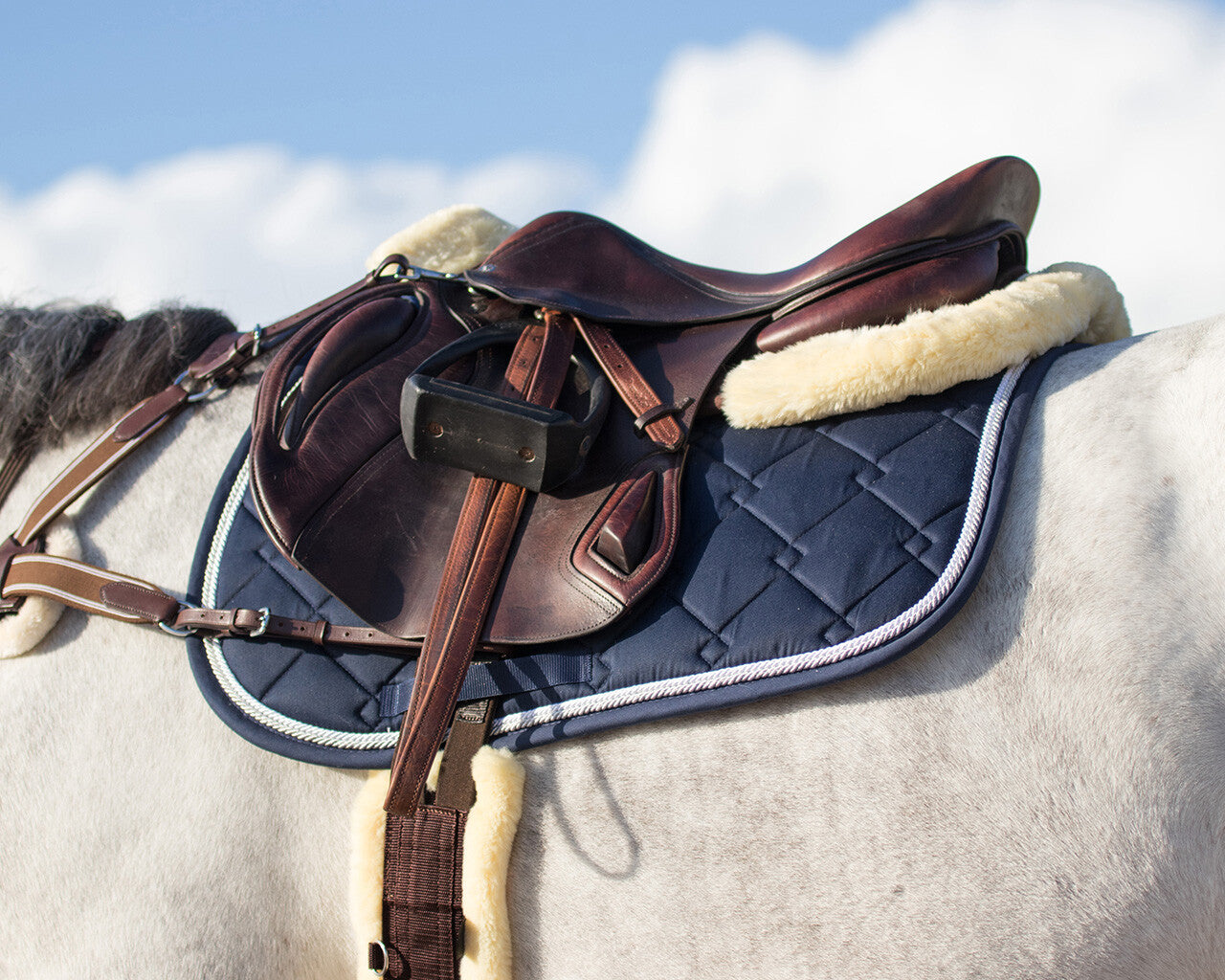 • This half pad is filled with memory which shapes itself to the saddle and the horse's back to provide an optimal fit, better pressure distribution and shock absorption. At the withers and along the rear an artificial fur border is placed. The suedine topside and fleece bottom ensure a stable position between the saddle and saddle pad.