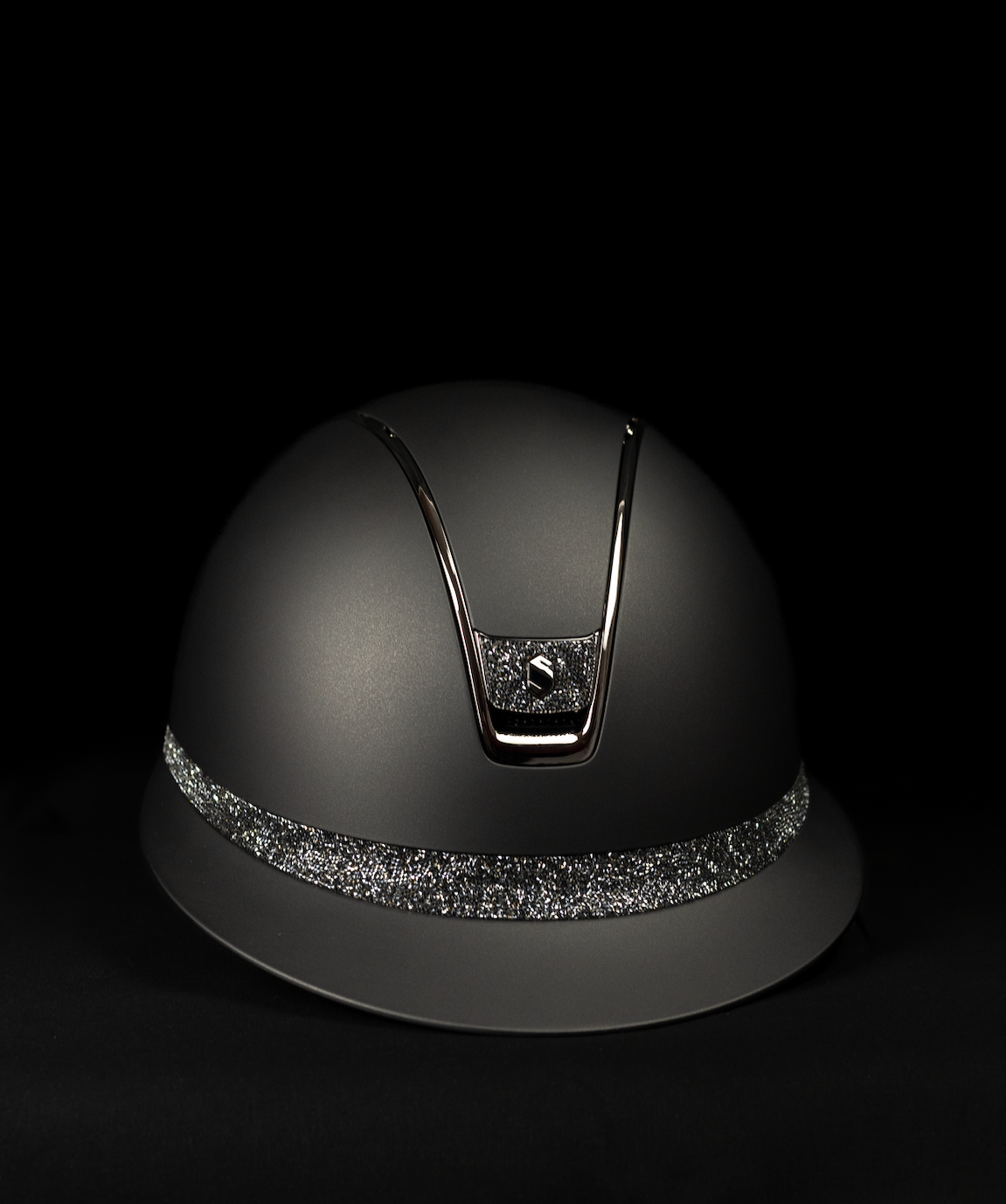 This Custom Samshield MissShield riding hat comes with an ultra fine rock crystal frontal band and blazon and a black chrome trim.