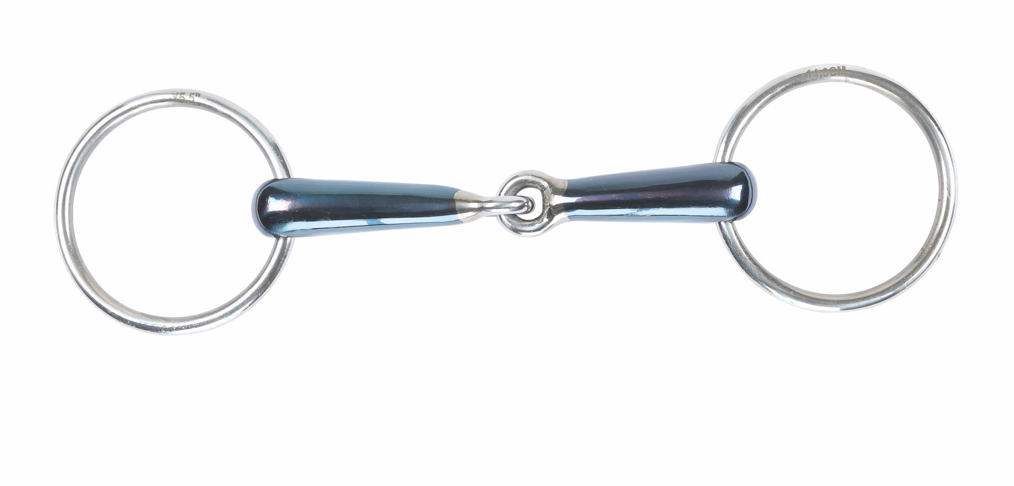 • This loose ring bit can discourage fixing as it has much more movement in the horse’s mouth. The hollow mouth is significantly lighter than those with a solid mouthpiece. Mouthpiece thickness: 18mm. Cheek height: 50mm (4.5", 5"), 65mm (5.5", 6"). Blue sweet iron mouthpieces oxidise easily to create warmth with a sweet taste which helps with bit acceptance and encourages salivation. Please note the blue colour will fade with use. Stainless steel is used for the cheeks due to it being durable, easy to clean and resistance to rust.