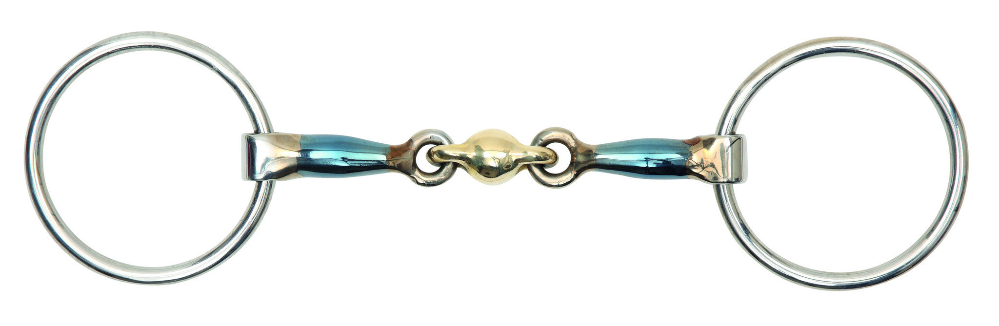 The loose ring cheek can discourage fixing and leaning as it has much more movement than a fixed cheek to follow the angle of the tongue. The shaped lozenge offers even pressure and encourages mouthing and contact.