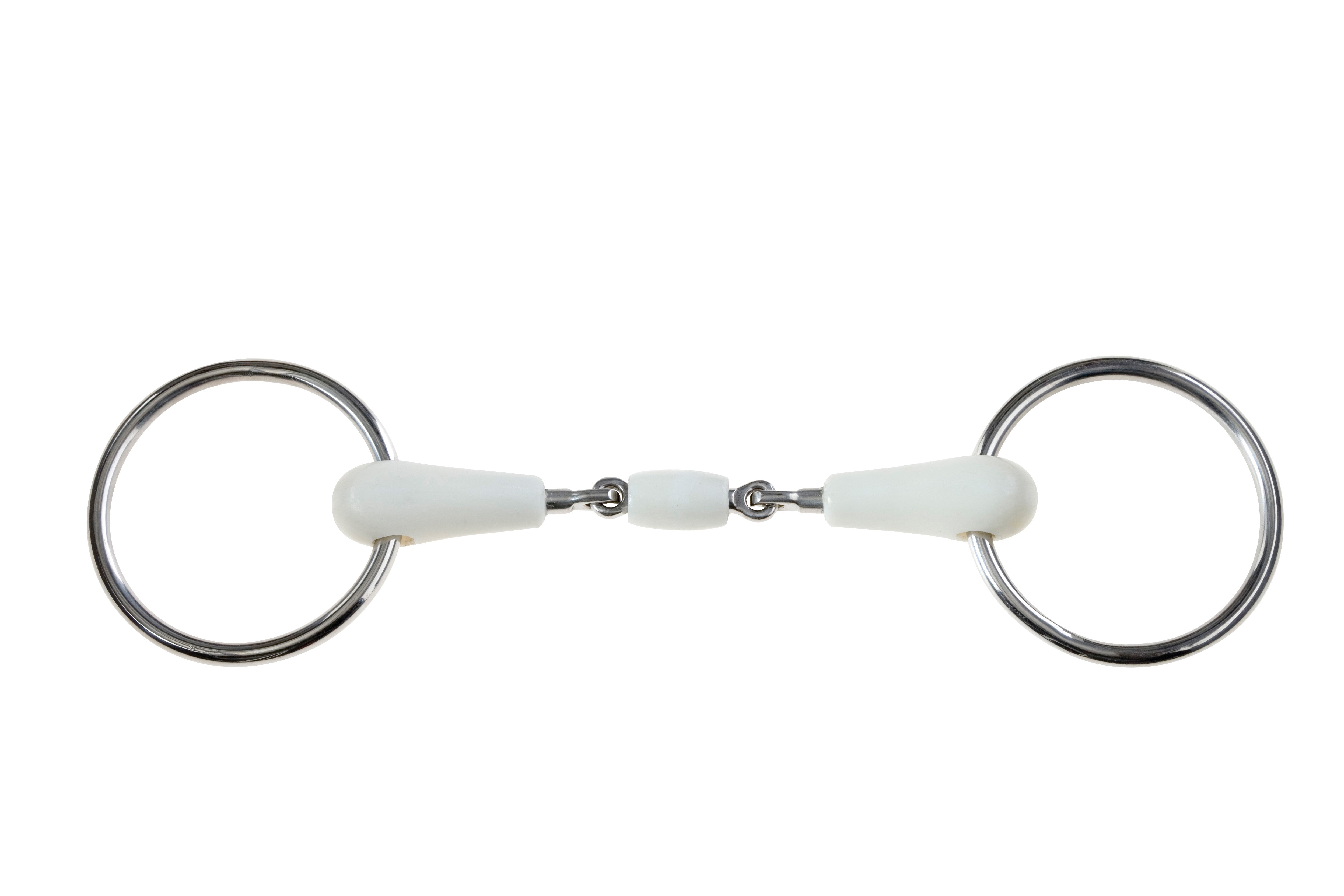 Oval Link reduces the nutcracker action Hi-tech plastic moulded around a stainless steel core Dressage legal The main action of the Oval Link Snaffle is on the tongue and the bars of the mouth. The central link drastically reduces the nutcracker action associated with single joint bits, which can cause horses to raise their heads to evade the bit. This bit is suitable for a horse or pony who is just starting their ridden career or for horses with sensitve mouths. The Korsteel JP Flexi Bits are made from hi-tech plastic which has been moulded around a core of stainless steel, so the durability of the bit is not compromised. The flexi mouthpiece is 'warmer' than a traditional stainless steel mouthpiece, which encourages acceptance of the bit. For this reason, the flexi mouthpiece is a good choice for younger horses and those with a sensitive mouth. This bit is dressage legal, and the plastic should be checked before every use for sharp edges where the horse may have chewed the mouthpiece.