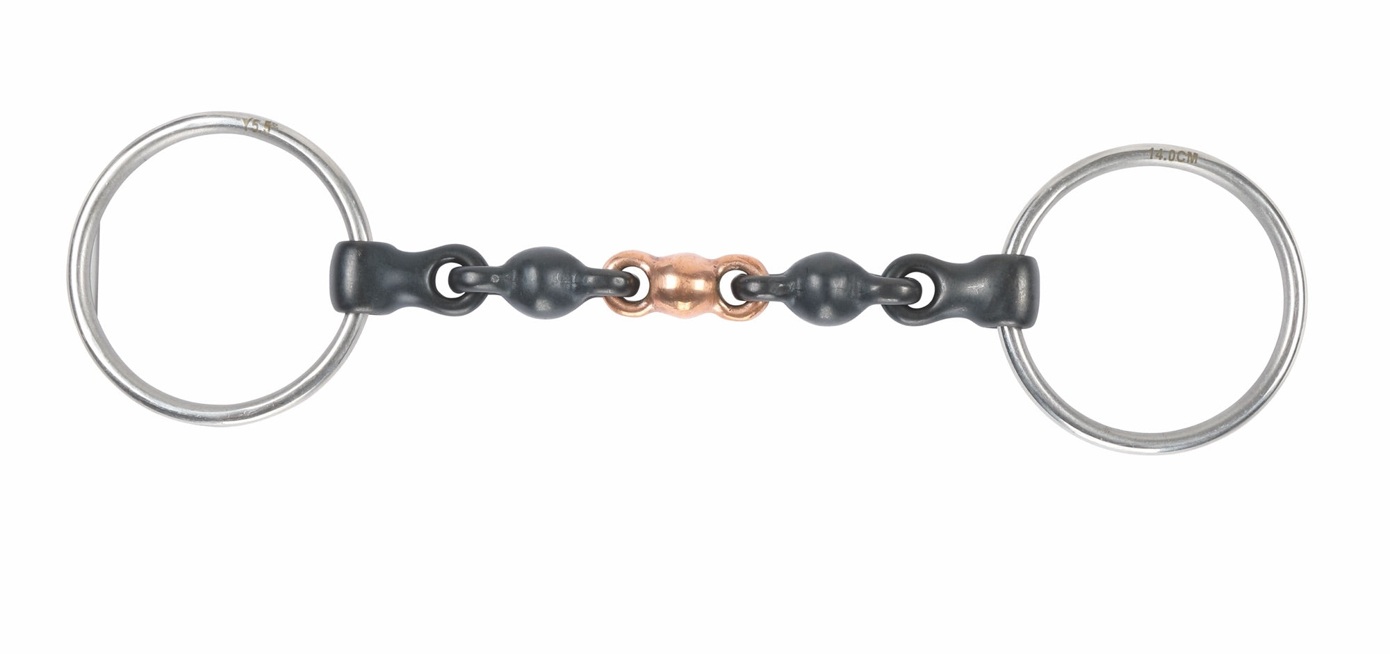• This loose ring has a Waterford mouth made of many different links which makes it difficult for the horse to take a hold. This bit should be used under supervision or by an experienced rider. Mouthpiece thickness: 18mm. Cheek height: 65mm. Sweet iron mouthpieces are designed to oxidize to produce a sweet taste which helps with mouthing. The addition of copper to the mouth ensures the horse will not take up too much of a contact, ideal for horses that can take a hold. Stainless steel is used for the cheeks due to it being durable, easy to clean and resistance to rust.