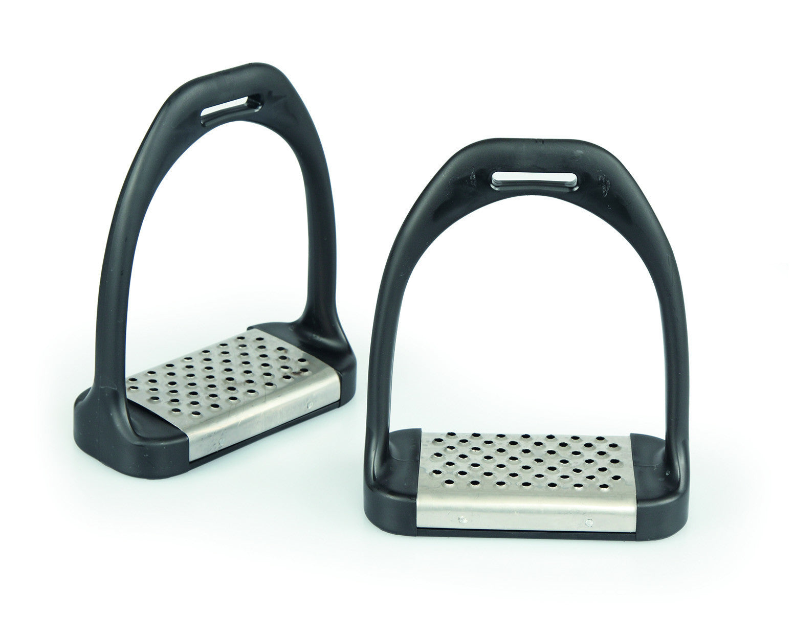 • These lightweight, strong and durable plastic stirrups come complete with high grip metal treads.
