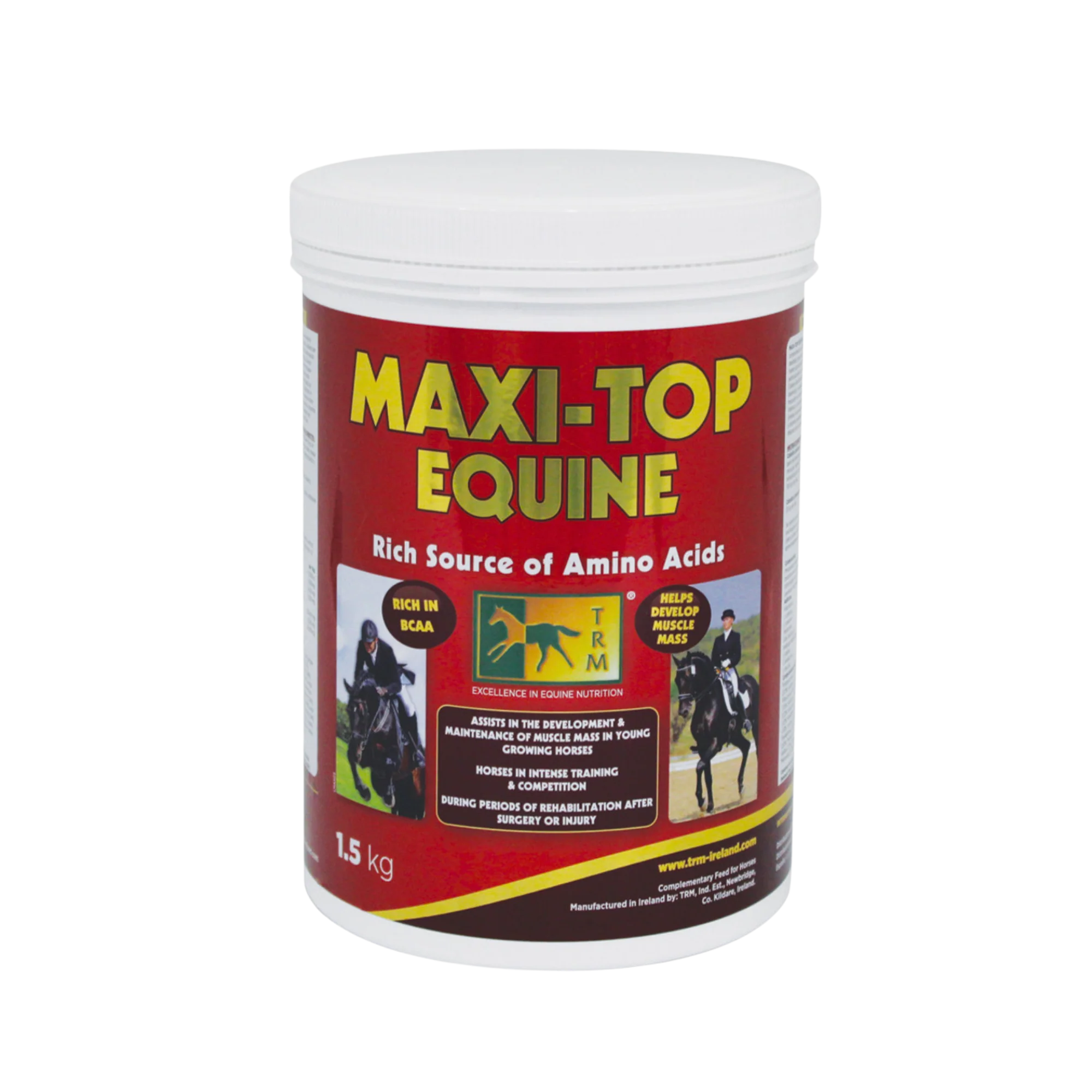 MAXI-TOP EQUINE is a complementary feed for horses, designed to supply a significant source of Amino Acids, particularly Branch Chain Amino Acids, which will assist in the development and maintenance of muscle mass in horses in intense training and competition, in young growing horses, and during periods of rehabilitation after surgery or injury.