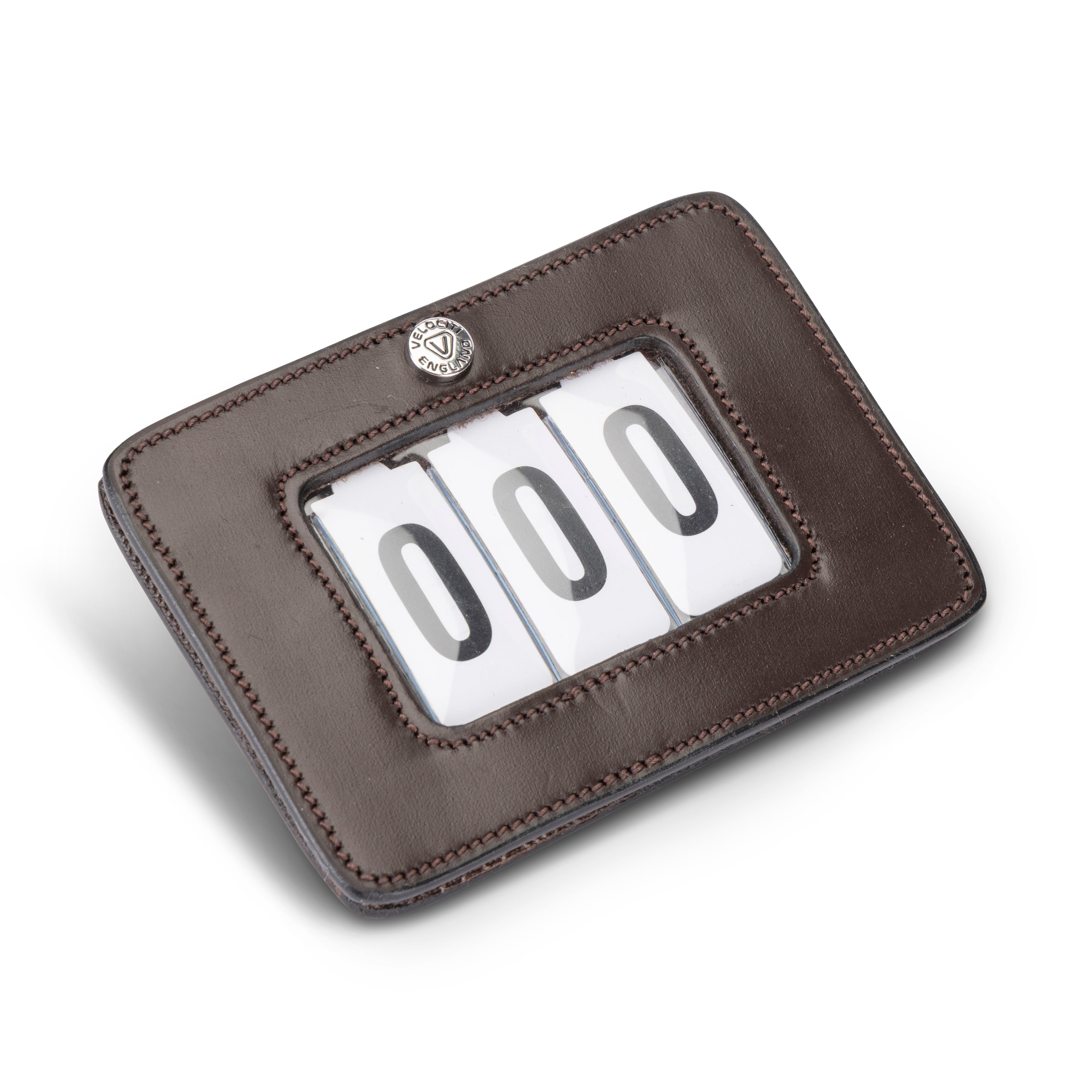 • Add your competition number to any saddlecloth using the Velociti number holder. The two sides pull apart for easy number changing, reattaching with touch close inner surfaces. Secures to the saddlecloth with a safety pin on the rear. The leather unit is supplied with a wipe clean 3 slot sleeve and 3 sets of numbers 0-9. Dimensions: H. 80mm, W. 110mm.